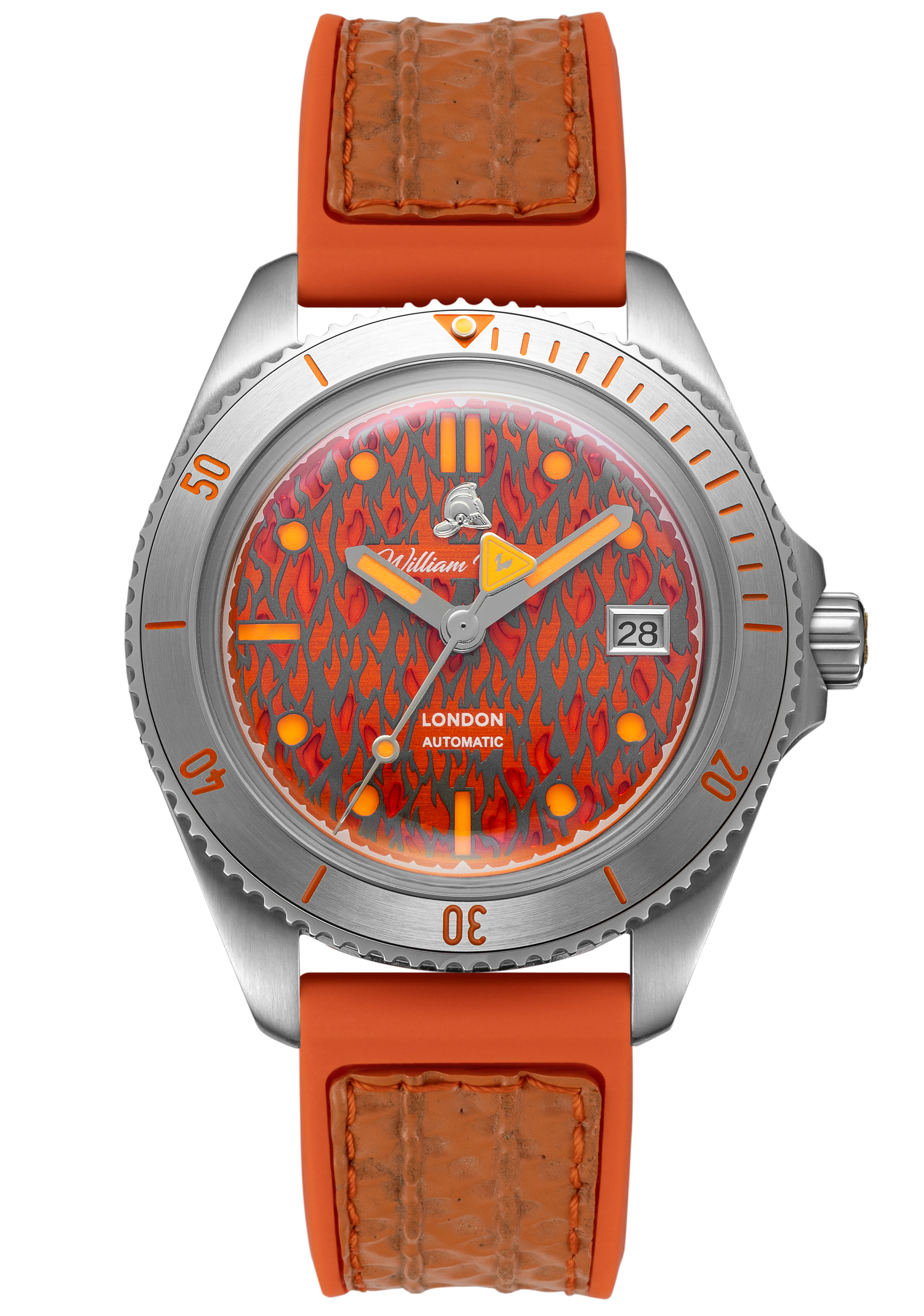 International Association of Fire Chiefs watch range comprising of our Valiant, Fire and Extinguisher Watch. Stainless steel automatic diving range featuring vintage fire bell seconds hand, fire engine pattern seconds track, crown made from a 100 year old melted-down British brass firefighter's helmet, IAFC crest caseback and straps made from upcycled fire hose. Beautifully presented in our genuine Italian leather, fire hose inspired travel roll, that holds up to 3 watches.